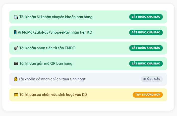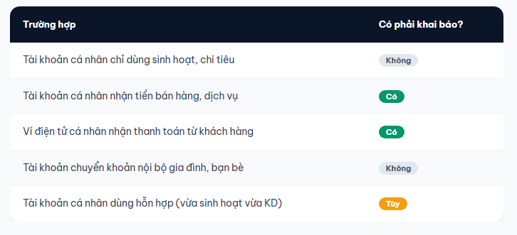Điều kiện chung: Tài khoản hoặc ví điện tử chỉ cần khai báo khi thực sự liên quan đến hoạt động kinh doanh. Tài khoản cá nhân chỉ dùng cho chi tiêu sinh hoạt không thuộc diện này.