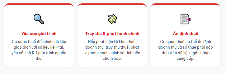 - Nếu phát hiện kê khai thiếu doanh thu, có thể bị ấn định thuế, truy thu thuế và tính tiền chậm nộp.