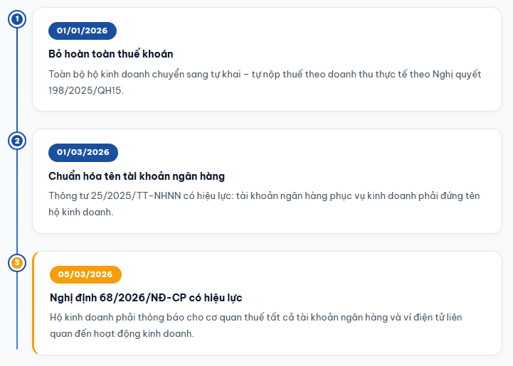 2. Thông tư 25/2025/TT-NHNN (hiệu lực từ 01/03/2026): Quy định tài khoản ngân hàng phục vụ hoạt động kinh doanh của hộ kinh doanh phải mang đúng tên đăng ký trên giấy chứng nhận hộ kinh doanh, không được dùng tên cá nhân chủ hộ như trước đây.